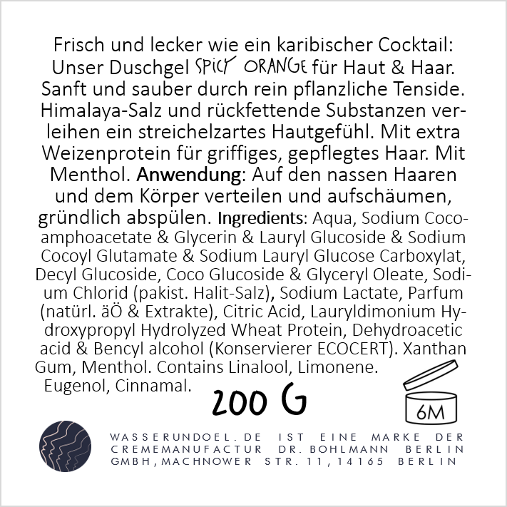 Wir arbeiten naturkosmetisch mit 100 % natürlichen Inhaltsstoffen, vegan und GMO-frei. Unser mildes Duschgel Spicy Orange Haut & Haar besteht aus folgenden Ingredienzien: